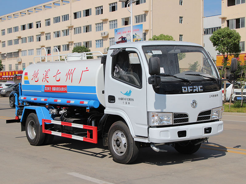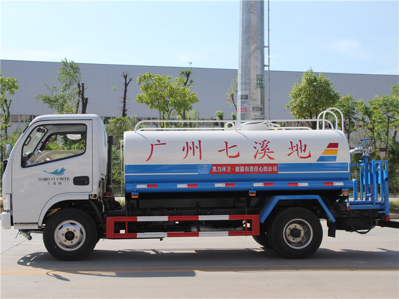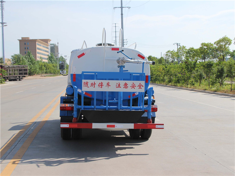 市政環衛5方灑水車價格參數配置圖片前裝有鴨嘴形噴嘴或圓頭沖嘴,后面裝有圓柱形灑水噴嘴或蓮蓬頭噴嘴,后部有一工作平臺,裝配有水炮。后部還可裝8個噴嘴。