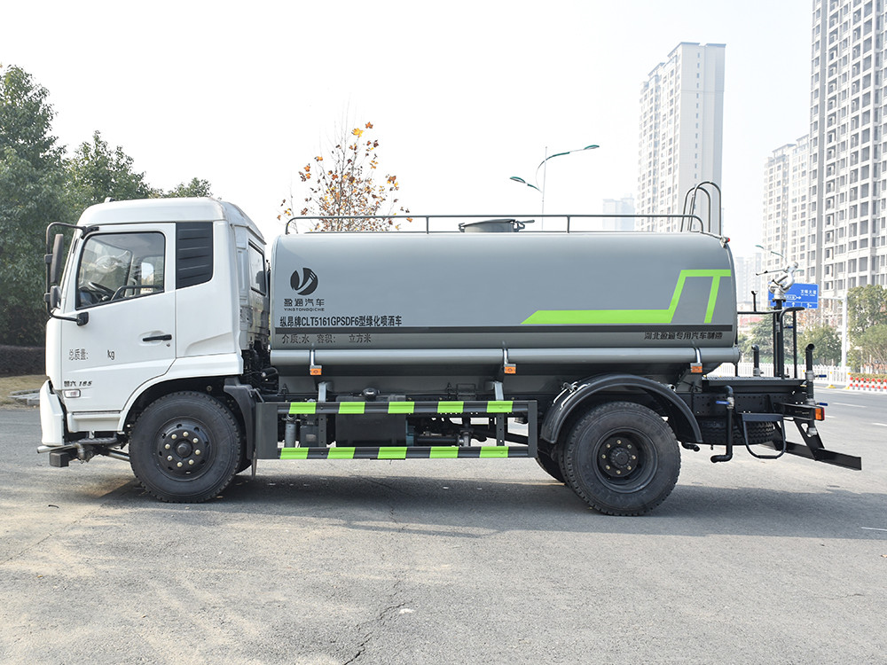 東風(fēng)天錦 12 噸灑水車產(chǎn)品標(biāo)配前噴(鴨嘴)、后沖、后灑、側(cè)噴、后置式工作 平臺,平臺上配置綠化水炮(可 360°旋轉(zhuǎn),既可以調(diào)成柱狀,也可 以調(diào)成霧狀,更可以調(diào)成直沖狀、大雨、中雨、小雨、毛毛雨),配 備優(yōu)質(zhì)大功率專用灑水泵(可自吸自排,可從河里或池塘抽水到罐體), 取力器,雜物過濾網(wǎng),消防接口,自流球閥系統(tǒng)、取力器、球閥、濾網(wǎng) 均為國家標(biāo)準產(chǎn)品,主管道加粗,法蘭墊、法蘭盤加厚,大通徑球閥。 整體具備性能優(yōu)良安全可靠、效率高、流量大、維修方便等特點。