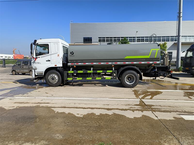 東風15噸灑水車標配前噴(鴨嘴)、后沖、后灑、側噴、后置式工作 平臺,平臺上配置綠化水炮(可 360°旋轉,既可以調成柱狀,也可 以調成霧狀,更可以調成直沖狀、大雨、中雨、小雨、毛毛雨),配 備優質大功率專用灑水泵(可自吸自排,可從河里或池塘抽水到罐體), 取力器,雜物過濾網,消防接口,自流球閥系統、取力器、球閥、濾網 均為國家標準產品,主管道加粗,法蘭墊、法蘭盤加厚,大通徑球閥。 整體具備性能優良安全可靠、效率高、流量大、維修方便等特點。