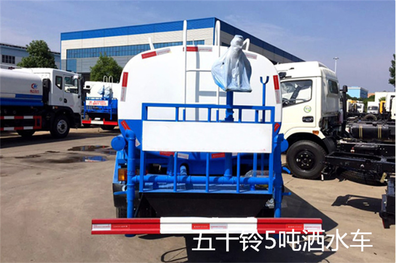 五十鈴5噸灑水車采用慶鈴五十鈴底盤,白色可前翻駕駛室,五十鈴120馬力國六發動機,5擋變速箱,軸距3360mm,4噸后橋,7.00R16原廠鋼絲胎,原廠abs,帶方向助力,離合助力器,氣剎制動。