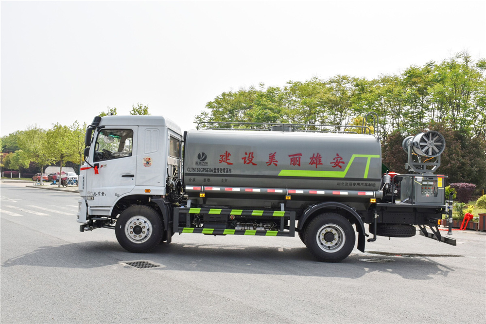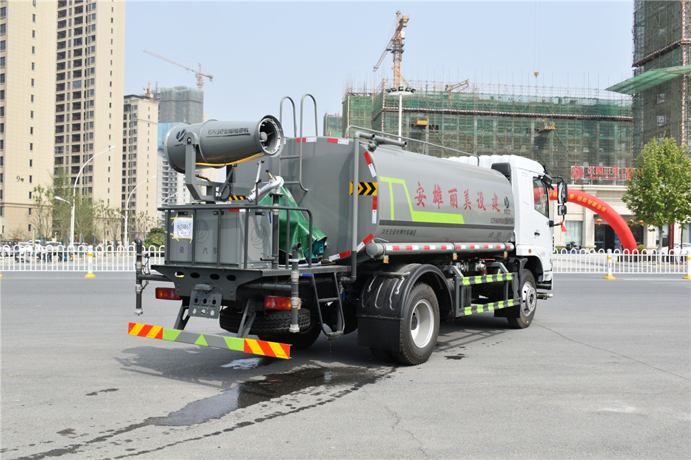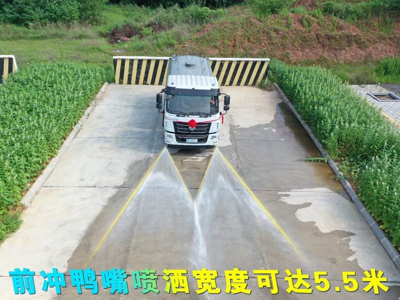 灑水車專用功能配置:罐體實際容積約為12立方米,(罐體有效參數(shù)9.79立方米、額定載質量9325kg、)采用武鋼優(yōu)質碳鋼板卷壓成型。配備專用灑水泵,自吸自排,前噴后灑、側噴、后工作平臺及灑水高壓炮。灑水泵自吸高度為6米左右,整車灑水寬度14米左右,后工作平臺水炮可調成:直沖狀、大雨、中雨、小雨、毛毛雨,有效射程≥28米,整車帶接頭、水位計,自流閥。后工作平臺主管路帶1寸澆花接口,附送2根3米水管,1個爬梯,兩側及后保險杠。