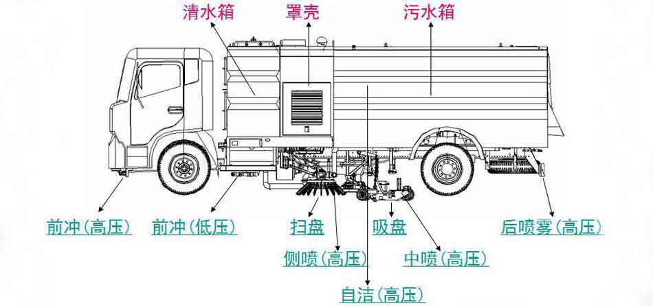 東風(fēng)D9洗掃車上裝配置:帶不銹鋼箱體,容積為9立方,帶2個(gè)中置掃盤,康明斯170馬力副發(fā)動(dòng)機(jī);意大利馬達(dá);德國高壓水泵(前沖/側(cè)噴/中噴/后噴霧/沖洗水槍/垃圾箱自潔裝置);萬向高壓路沿清洗噴頭,威龍低壓泵(前沖);不銹鋼垃圾箱;不銹鋼管高壓管路;德國控制器;韓國控制箱;PLC一鍵控制;尾部LED箭頭燈;機(jī)油、垃圾箱、水箱均帶防溢低水位報(bào)警裝置;倒車及洗掃狀態(tài)室內(nèi)監(jiān)視器。18m高壓沖洗卷盤。清掃寬度3.5m;清洗壓力10MPa;吸入粒度φ110mm。