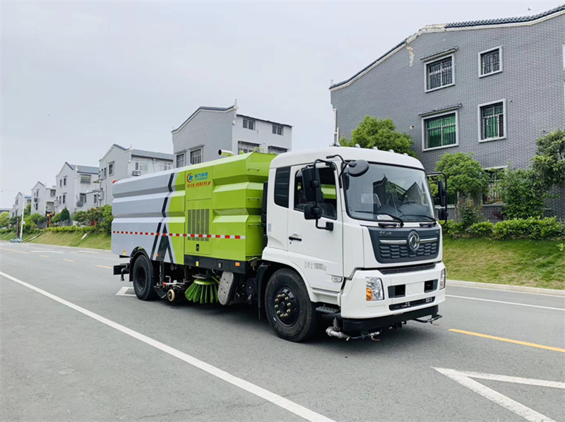 Ø 洗掃車采用東風天錦DFH1180EX8型國六二類汽車底盤改裝,加裝副發動機、風機、高壓水泵、清水箱、垃圾箱、左右立掃、帶噴水桿的寬吸嘴、低壓沖洗系統、掃盤降塵系統、液壓系統、專用裝置電控系統和副車架等改裝而成。