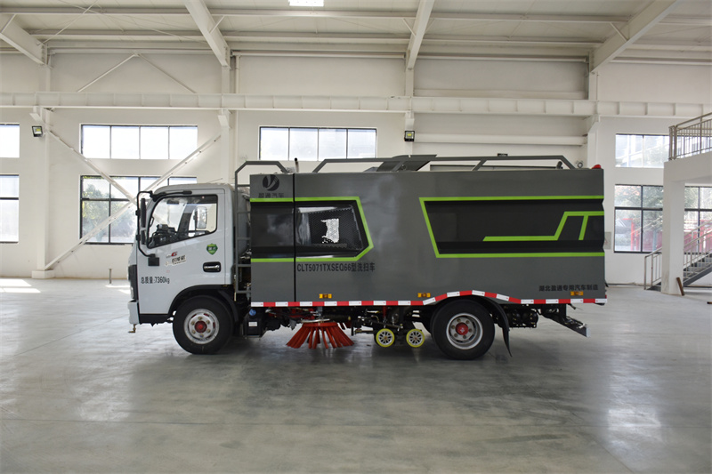 CLT5071TXSEQ6 型洗掃車功能介紹 1. 東風多利卡洗掃車采用洗,掃,吸,混合的方式收集垃圾,濕式除塵、電液 PLC 一鍵控制,液壓傾翻卸料的作業(yè)方式對路面進行清掃作業(yè)。 2. 采用副發(fā)動機專門驅(qū)動風機和液壓系統(tǒng),保證行駛過程中能繼續(xù)工作,保證 清掃過程的連續(xù)性。 3. 采用“中置兩掃盤 +噴霧降塵+中置寬幅吸嘴(內(nèi)置高壓噴桿及兩側(cè)高壓噴 桿)”的結(jié)構(gòu)布局,對泥濘路面有更好的清潔效果,清掃過程中砂石不在飛 濺揚塵,此布局便于清掃裝置與吸盤的調(diào)整與維護,轉(zhuǎn)場作業(yè)時整車通過性 好。 4. 副發(fā)動機與風機之間的傳動設(shè)置設(shè)有自動離合器,可保證副發(fā)動機空載啟動 和停機時與風機的自動脫離,降低了對副發(fā)動機的沖擊,提高了副發(fā)動機的 工作可靠性和使用壽命。 5. 掃盤有遇障礙自動避讓保護功能和自動復位功能,遇到障礙自動回縮,越過 障礙自動回位。 6. 掃盤轉(zhuǎn)速可根據(jù)各種不同的清掃工況來調(diào)整轉(zhuǎn)速,能保證在各種污染狀況下 都有良好的清掃效果 7. 采用先進,高效的專用風機和可隨路面自動找平的全浮動式吸嘴,清掃效果 好,使用壽命長