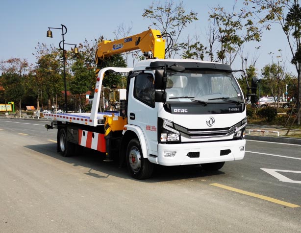 隨底盤選裝駕駛室;僅采用4400mm軸距;托舉質量為4730kg;吊機型號/吊機重量/最大起升載荷(kg):SQS100/1440/4000,側防護材料Q235,由一個連續平面加工具箱組成,焊接連接;后部防護裝置由專用裝置后托臂代替,后部下邊緣離地高度:500mm;ABS型號/廠家:ABS型號:ABS/ASR-24V-4S/4M,廠家:襄陽東風隆誠機械有限責任公司;該車主要用于道路清障,專用裝置為平板、拖臂、吊機、絞盤、鋼絲繩.