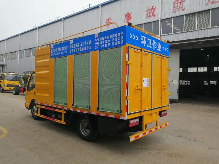 底盤型號:EQ1041SJ3BDF,發(fā)動機玉柴YC4FA115-50,7.00R16鋼絲胎,帶動轉(zhuǎn),氣剎,方向助力,整車顏色工程黃。 上裝配置:18.5千瓦電機1臺,配電柜1臺,4寸排污泵一臺,5.5KW水循環(huán)真空泵1臺,3方高壓水箱,1.5立方液壓絞龍式/滾筒式污水分離箱,帶高壓清洗功能,采用意大利普蘭索特16MPA高壓泵,箱體材質(zhì)采用熱板制作,后部帶LED屏,配工具箱一個。100mm吸污管4根(每根6米),60米Ф19mm的高壓管,帶10個噴頭。