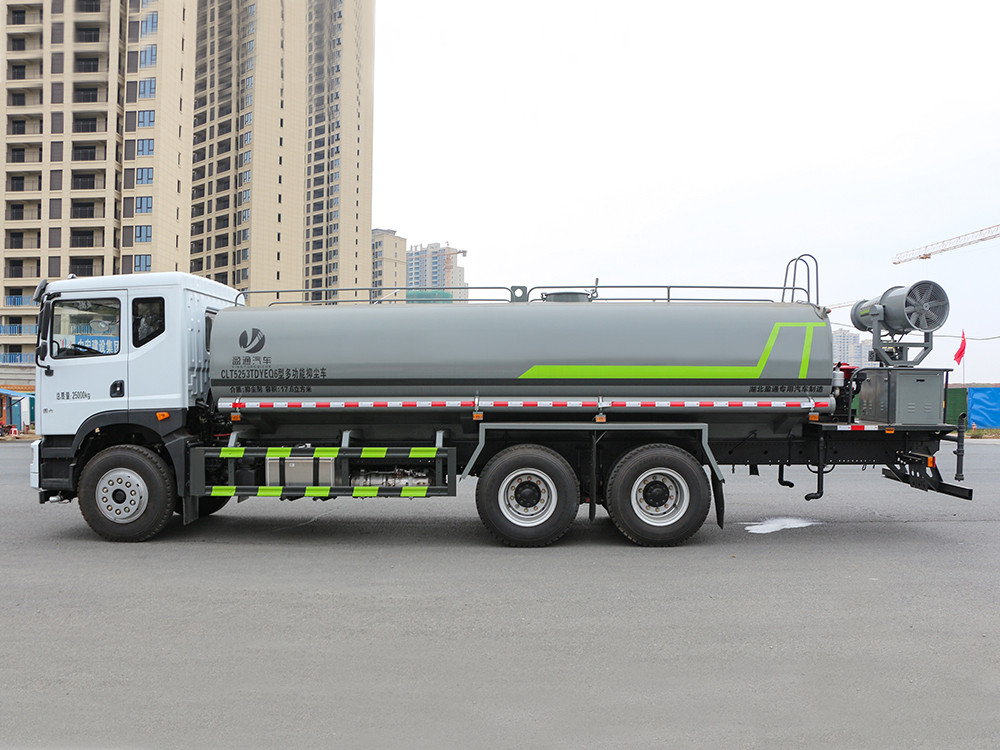東風華神T5 -20方抑塵車-大型霧炮車產品主要技術參數 序號 名稱 型號、規格 1 整車型號 CLT5253TDYEQ6 型多功能抑塵車 2 發動機型號 B6.2NS6B260 3 發動機馬力/功率 康明斯 260 馬力/191KW 4 發動機排量 6200ML 5 變速箱 法士特 8 檔(帶高低檔) 6 輪胎規格 11.00 鋼絲胎 7 軸距 4350+1350 8 總質量 25000KG 9 整備質量 11400KG 10 額定載質量 13405KG 11 整車尺寸(長×寬×高) 10.45*2.51*3.2 12 罐體容積 20 方 13 燃料種類 柴油 14 排放標準 國六 15 水泵型號 60/90 16 罐體材質 Q235 碳鋼