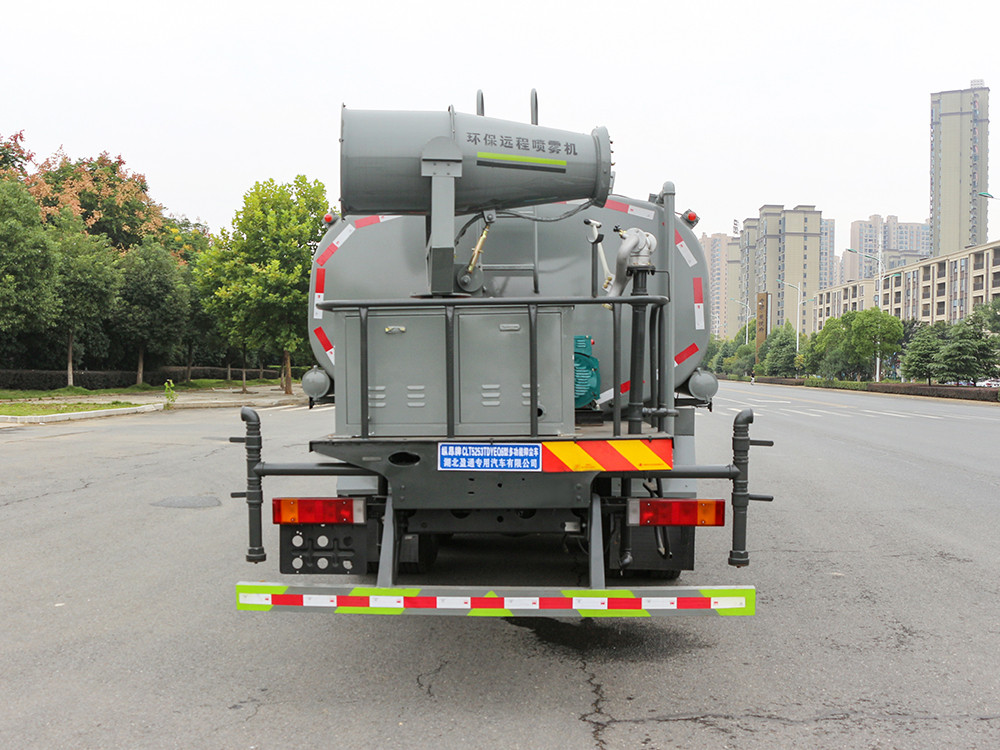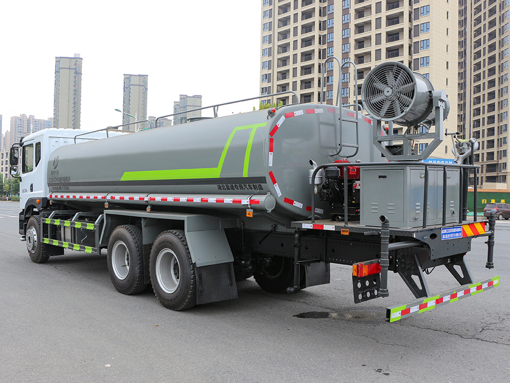東風華神T5 -20方抑塵車-大型霧炮車產品配置 1.底盤配置: 發動機康明斯 260 馬力(六缸),法士特 8 檔變速箱,前橋 5 噸,雙 10 噸后橋,11.00 鋼絲胎,軸距 4350+1350,斷氣剎,ABS,空 調,氣囊座椅,電動玻璃,中控鎖。多功能方向盤。2.上裝配置: 1、罐體約為 20 方,可加裝 30-40 型霧炮 2、邊燈帶電,罐體尾部上方標配 2 個紅色示寬燈, 3、標配前噴為鴨嘴直沖,標配后沖,用戶可根據自己的需求,來調 整對沖位置。 4、花紋防滑平臺,炮筒后蓋為定制型螺栓卡扣, 5、前噴、后沖、后灑、側噴,綠化高炮開關球閥均采用 50 大通經 不銹鋼球閥, 6、新式軸承式水炮,更加耐用, 7、60-90 型水泵, 8、防腐法蘭墊片, 9、鋁制后灑,不易炸開 10、罐體自動焊(美國林肯焊機及電源),拼板自動焊接,封頭環 縫焊接,無氣孔,焊縫美觀。 11、側護網、后保險杠、均為螺栓連接,方便拆卸,維修方便。 12、塑料擋泥板,替代鐵擋泥板,更加輕便,用螺栓連接,方便拆 卸。 13、前部、后部主管連接處為 6 孔圓法蘭,不易沖墊
