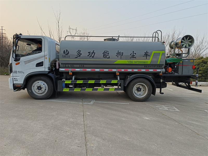 東風新款8-10噸霧炮灑水車標配前噴(鴨嘴)、后沖、后灑、側噴、后置式工作 平臺,平臺上配置綠化水炮(可 360°旋轉,既可以調成柱狀,也可 以調成霧狀,更可以調成直沖狀、大雨、中雨、小雨、毛毛雨),配 備優質大功率專用灑水泵(可自吸自排,可從河里或池塘抽水到罐體), 取力器,雜物過濾網,消防接口,自流球閥系統、取力器、球閥、濾網 均為國家標準產品,主管道加粗,法蘭墊、法蘭盤加厚,大通徑球閥。 整體具備性能優良安全可靠、效率高、流量大、維修方便等特點
