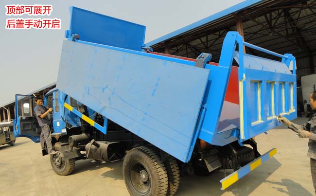 載重量10噸,外形尺寸長4.2米,寬2.3米,高0.8米,采用4毫米厚鋼板制作,箱頂可展開,可向兩邊展開折疊,箱底雙缸液壓自卸,手動(dòng)開啟尾門。
